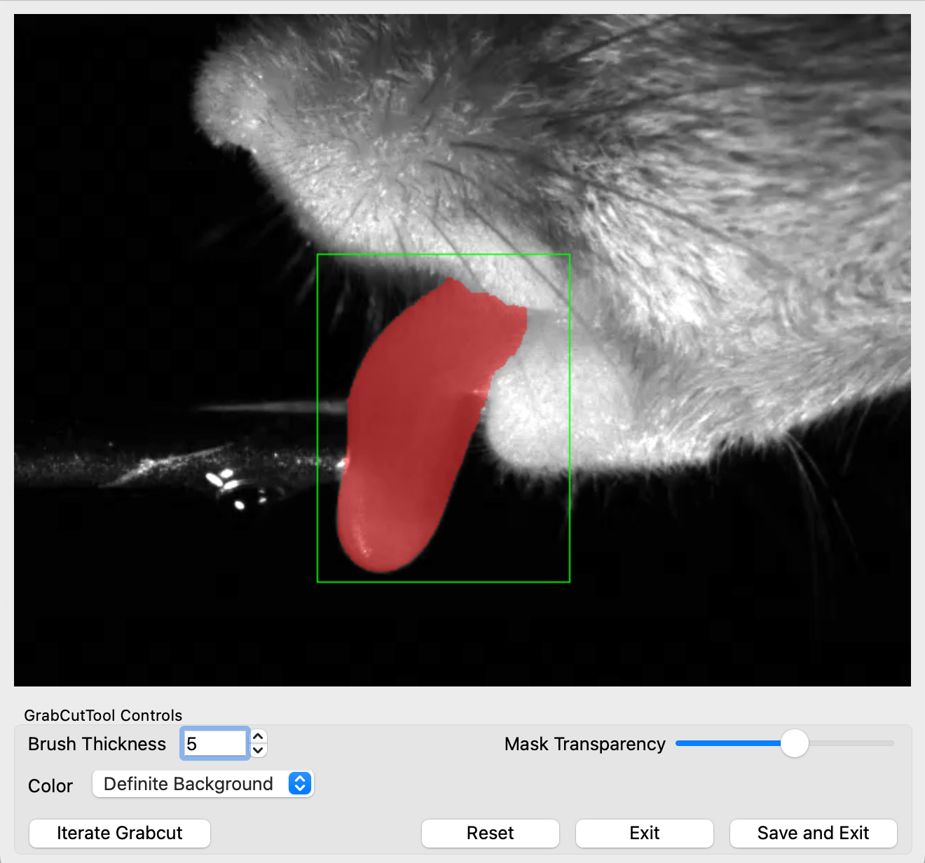 The GrabCut tool may be exited at any time by pressing the “Exit” button. “Save and Exit” will exit the tool and save the mask into the main application and displayed in the media player. All created masks can be saved to disk using the “Save Drawn Masks” button in the Tongue Tracking widget.